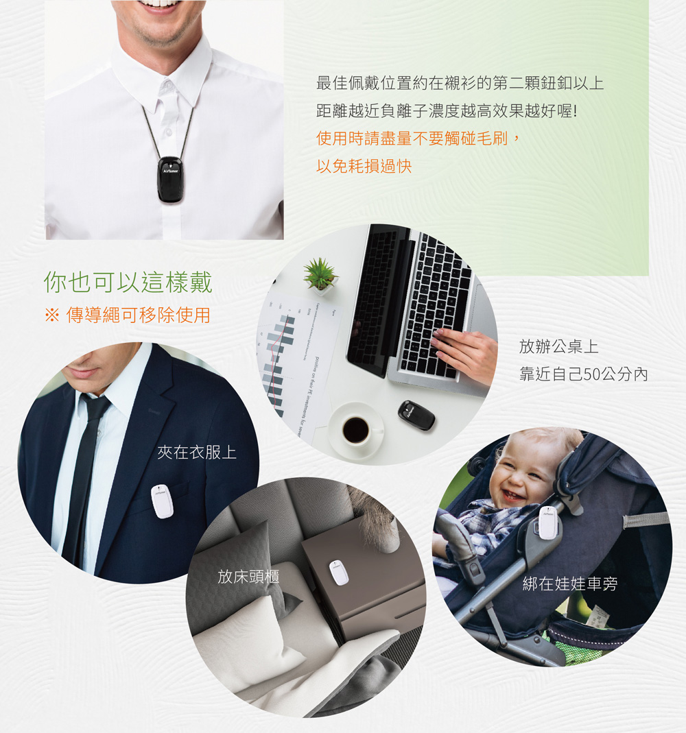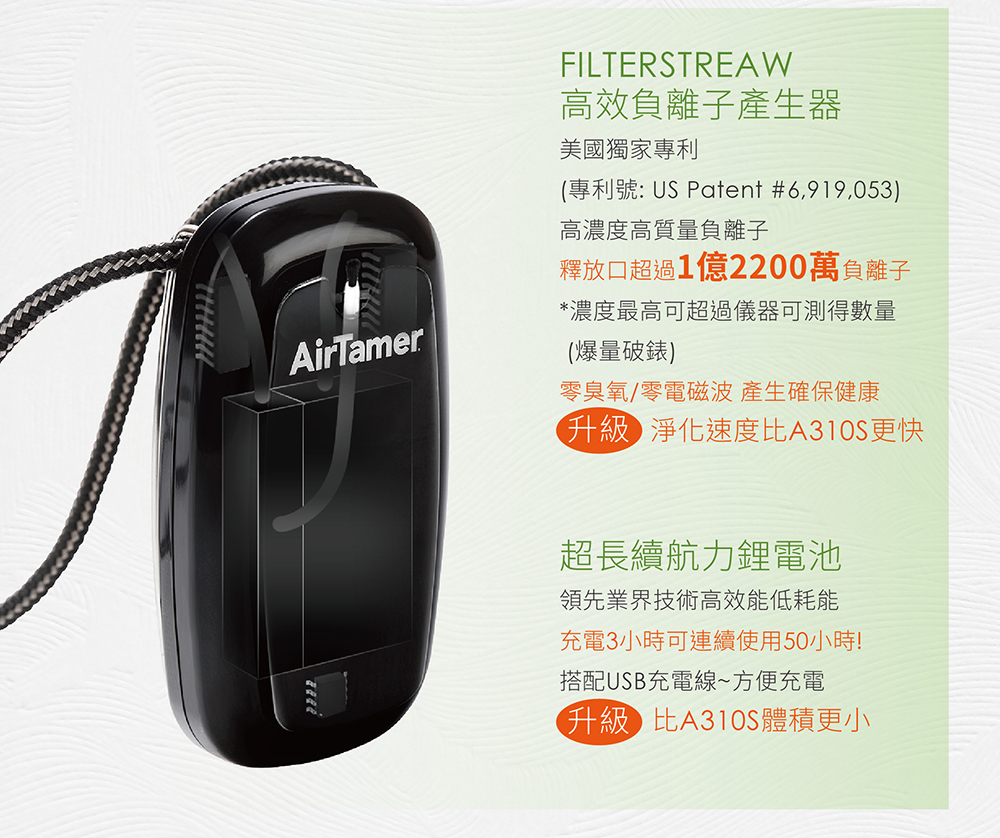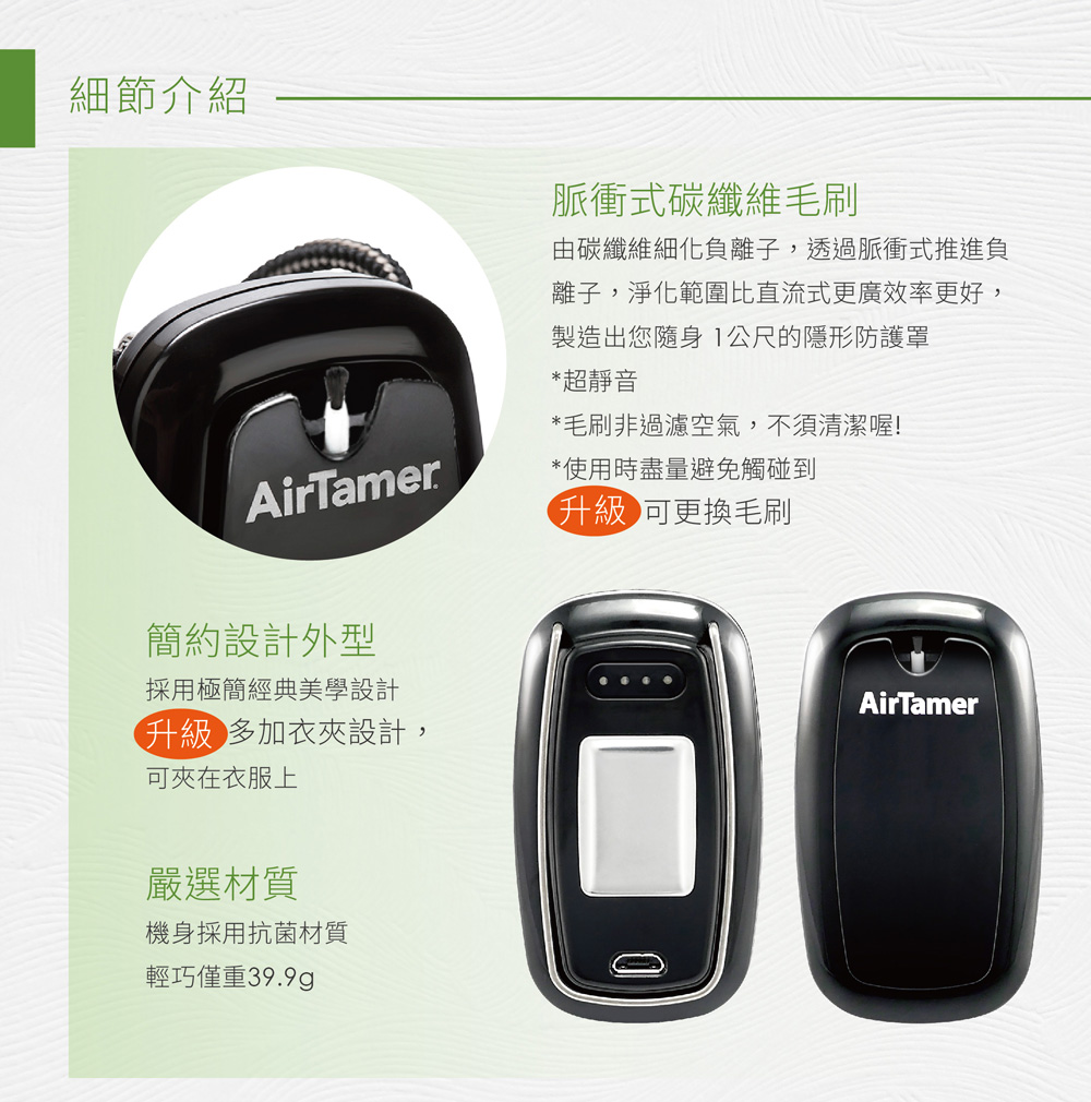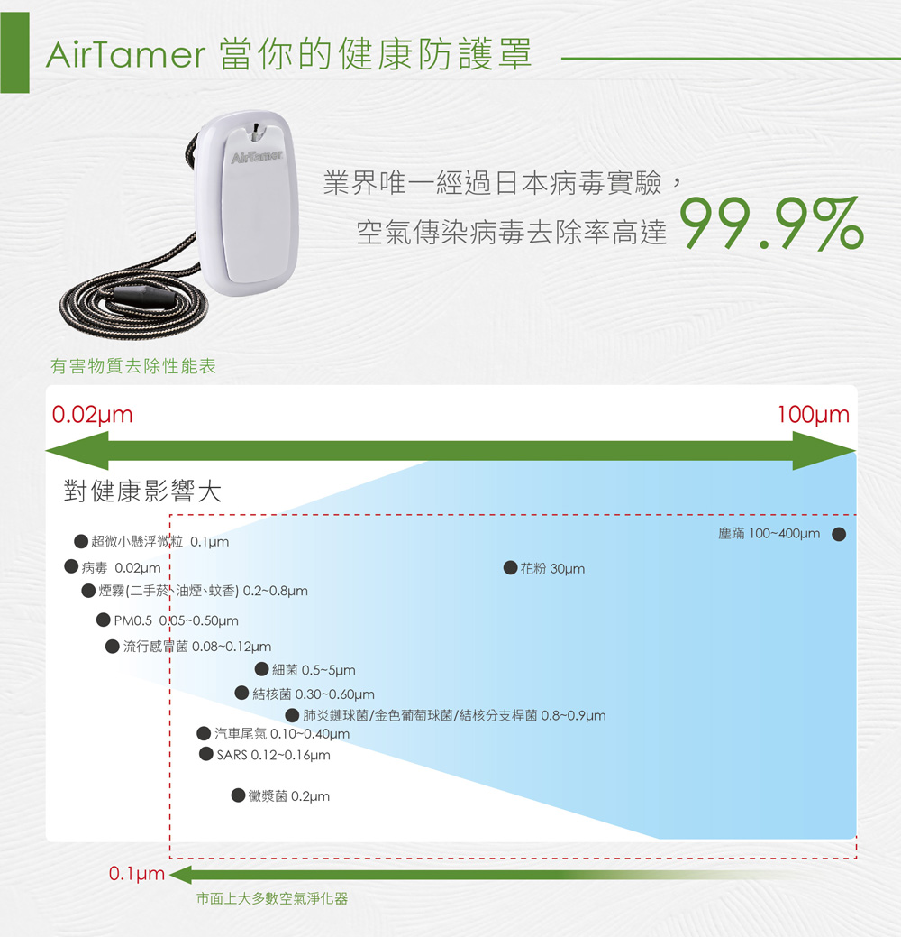 AirTamer 美軍高規健康防護罩:全新升級超輕巧40g、磁吸式替換刷毛經實驗證實有效去除99%空氣傳播病毒經實驗證實可去除99%H1N1病毒可去除PM2.5 99.92%除菌率高達94%充3小時電可連續使用50小時可迅速淨化一公尺內空氣真正0電磁波(飛機上、醫院內都可以使用)近乎0臭氧排放,符合國家安全標準