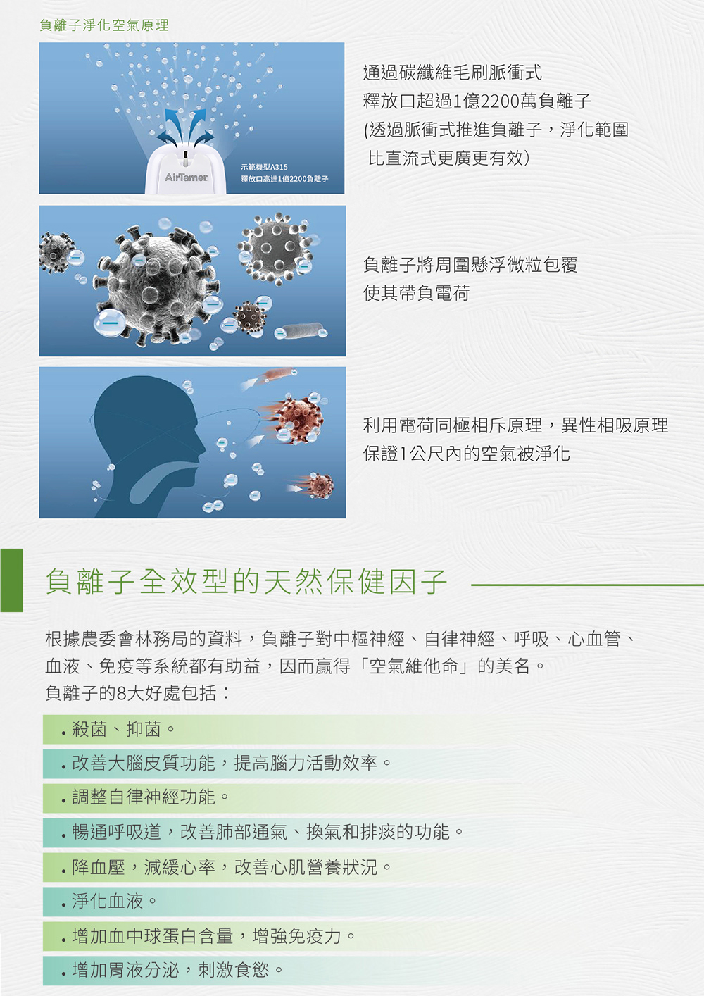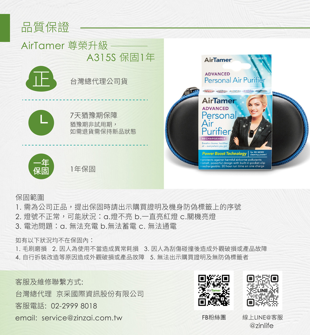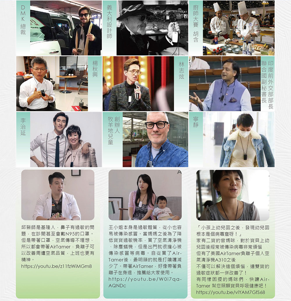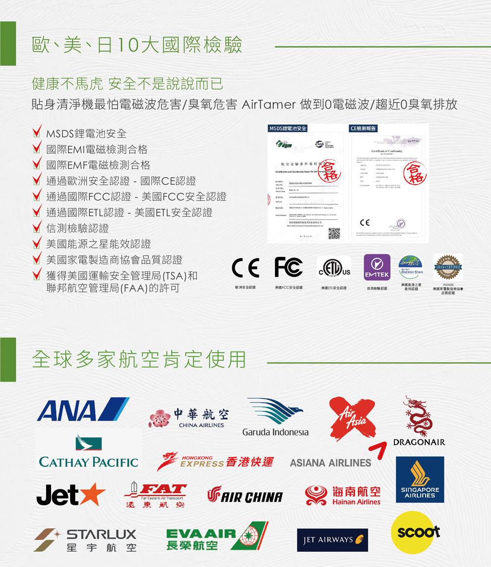AirTamer 美軍高規健康防護罩:全新升級超輕巧40g、磁吸式替換刷毛經實驗證實有效去除99%空氣傳播病毒經實驗證實可去除99%H1N1病毒可去除PM2.5 99.92%除菌率高達94%充3小時電可連續使用50小時可迅速淨化一公尺內空氣真正0電磁波(飛機上、醫院內都可以使用)近乎0臭氧排放,符合國家安全標準